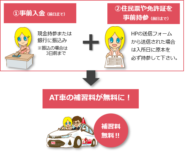 【①入所前日までに住民票を提出 + ②入所前日までに教習料金を入金】(どちらか一方だけでは対象外となります)